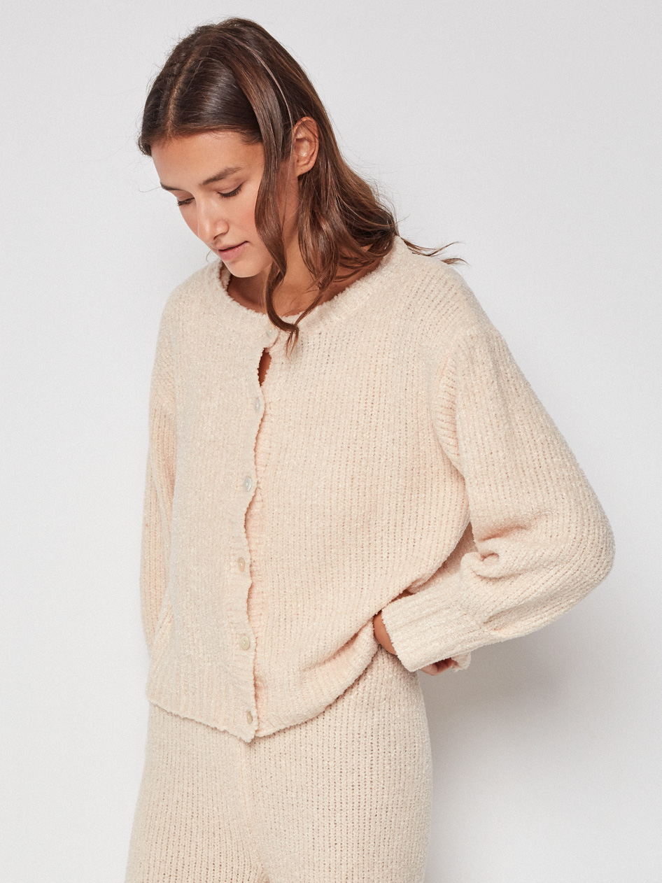 - модель кардигана свободного кроя с перламутровыми пуговицами;